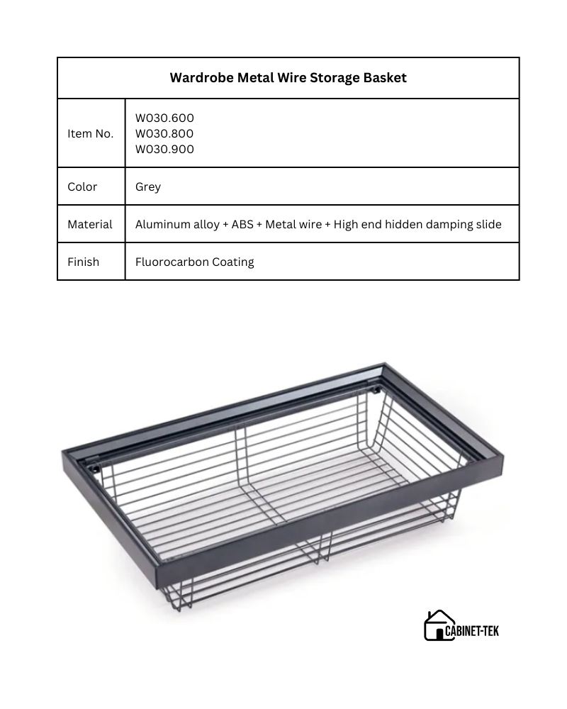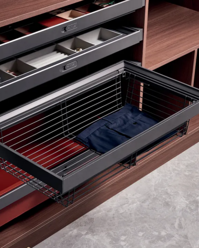 Metal Draw Basket Soft Sliding Wardrobe Solutions. Strong & Durable Deep In Design – Can Be Used With Other Sorting Boxes or Baskets.