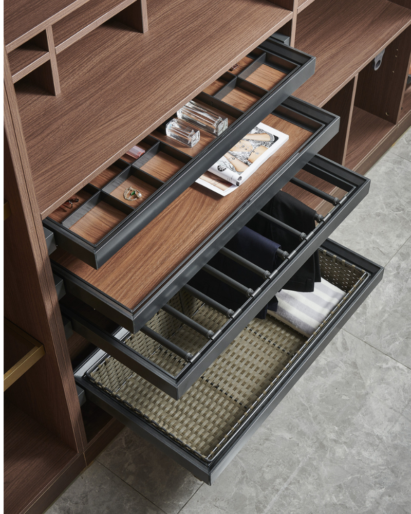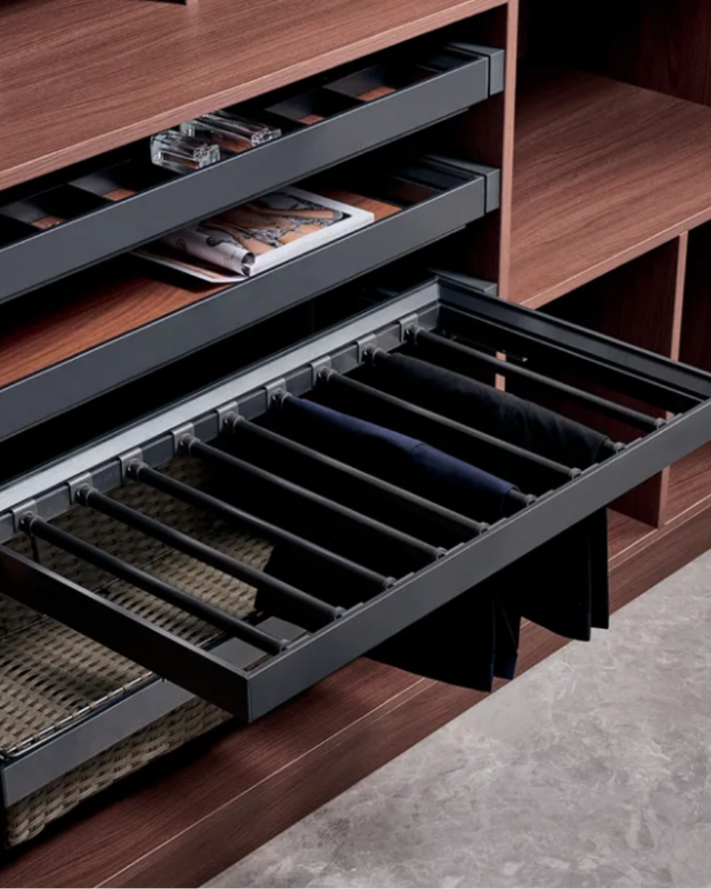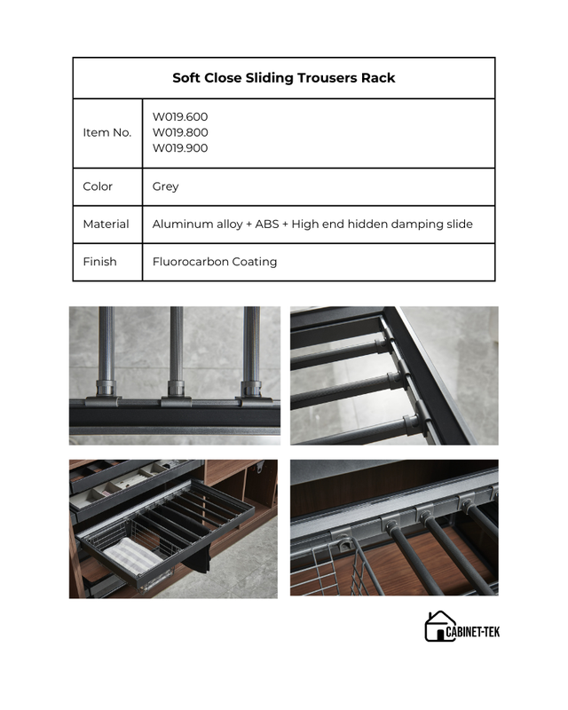 Smooth Sliding – Soft Closing Pants Rack. Keep Your Trousers Pressed & Clean Ready To Go. Can Be Use With A Combination Of Other Draws.