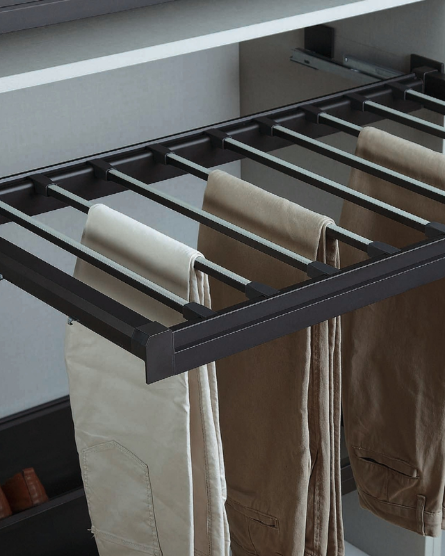 Slide Soft Closing Two Way Pants Rack Storage Draw. Sleek Design – Non Crease For Your Wardrobe.